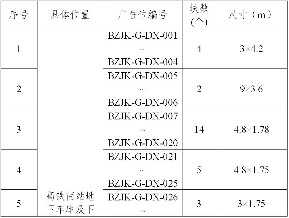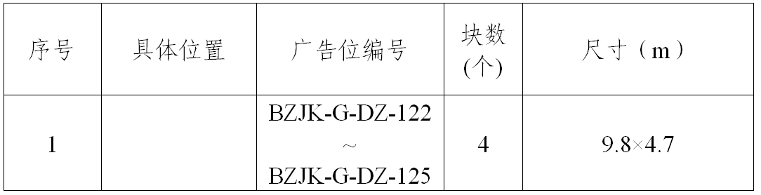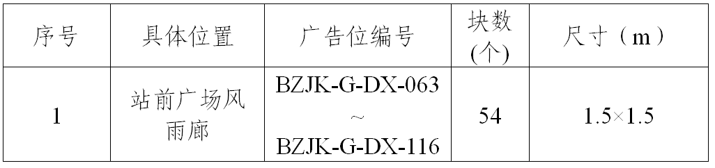 (一)項(xiàng)目概況:安徽通享交通科技有限公司擬對(duì)亳州公路客運(yùn)高鐵樞紐站廣告位競(jìng)選合作單位,廣告位的位置、面積等具體情況如下表所示: