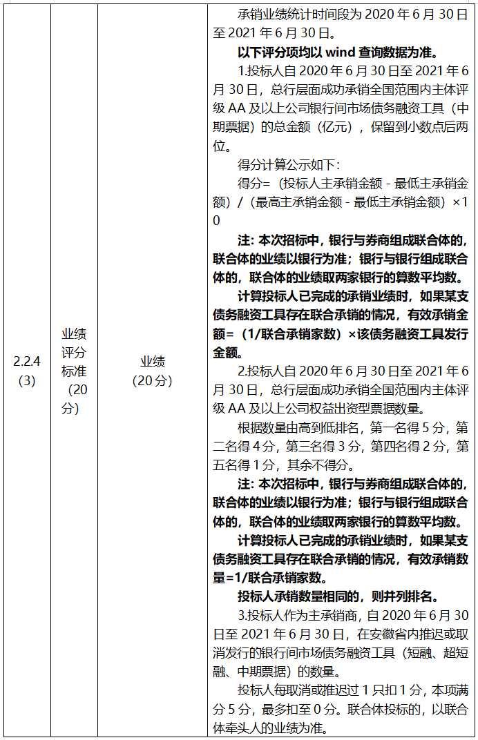 經(jīng)研究,亳州交控集團(tuán)2021年銀行間市場債務(wù)融資工具(中期票據(jù))主承銷商(項目編號:BZJK-2021-047號)招標(biāo)文件第三章評標(biāo)辦法(綜合評估法)評標(biāo)辦法前附表“2.2.4(3) 業(yè)績評分標(biāo)準(zhǔn)”修改如下:
