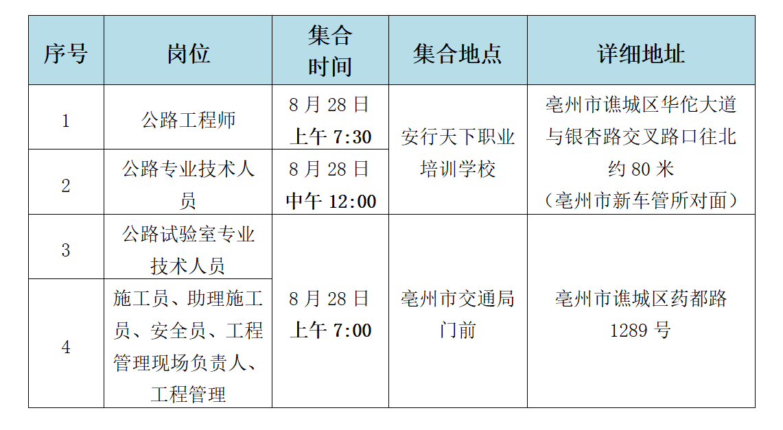 亳州市交通資產(chǎn)管理有限責(zé)任公司2021年工程專業(yè)技術(shù)人員實(shí)操測(cè)試時(shí)間定于2021年8月28日(本周六)上午7:00開始,具體安排如下: