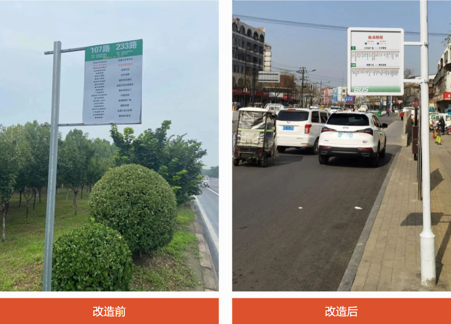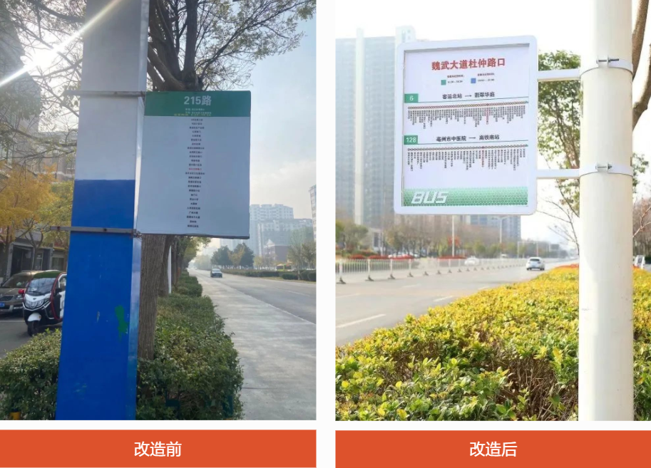 舊站牌為簡(jiǎn)易鐵皮式,長(zhǎng)期日曬雨淋會(huì)導(dǎo)致張貼的線路圖脫落,影響美觀,也不便于市民瀏覽。升級(jí)改造后的公交站牌采用內(nèi)嵌式結(jié)構(gòu),材料是鍍鋅板焊接不銹鋼管,連接部分使用抱箍固定,不僅安全穩(wěn)固,而且外形美觀、信息明了,能夠?yàn)槌丝吞峁└忧逦某塑?chē)指引服務(wù)。
