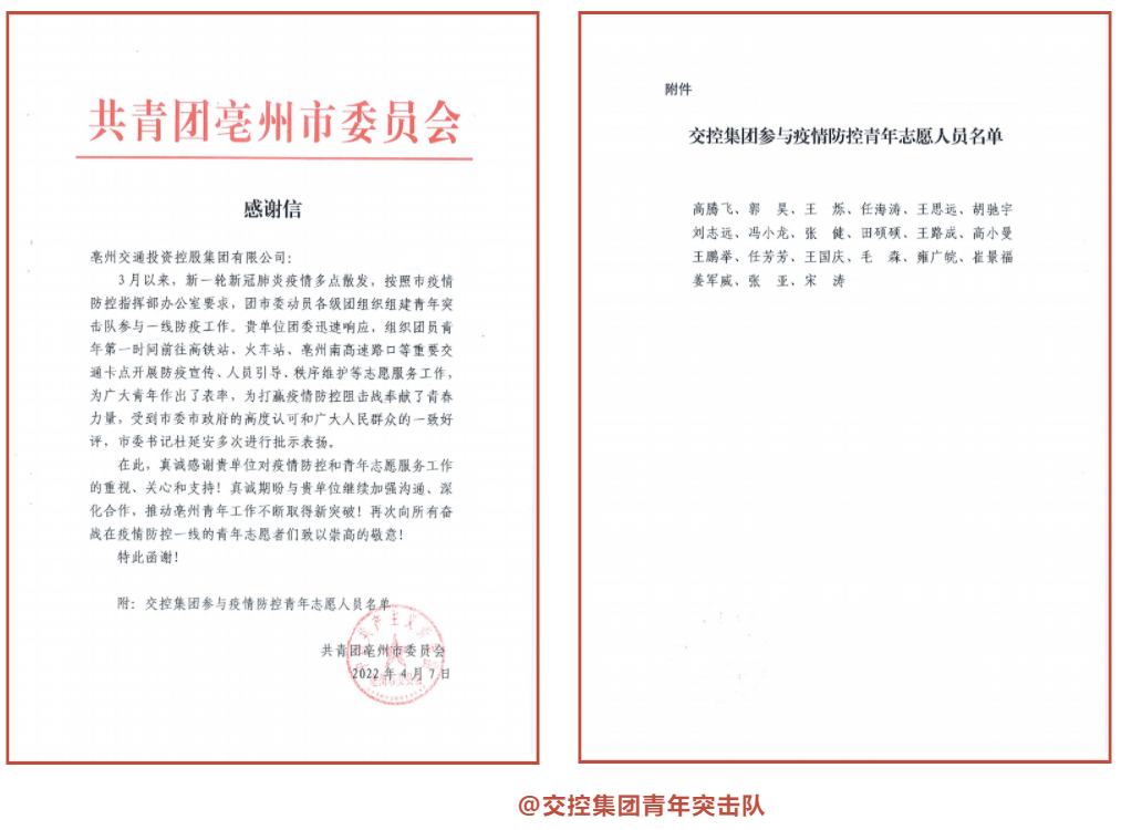 4月7日,交控集團(tuán)收到來(lái)自團(tuán)市委發(fā)來(lái)的感謝信,對(duì)集團(tuán)迅速組建青年突擊隊(duì)積極參與疫情防控,第一時(shí)間前往高鐵站開(kāi)展防疫宣傳、人員引導(dǎo)、秩序維護(hù)等志愿服務(wù)工作,予以充分肯定與表?yè)P(yáng)。