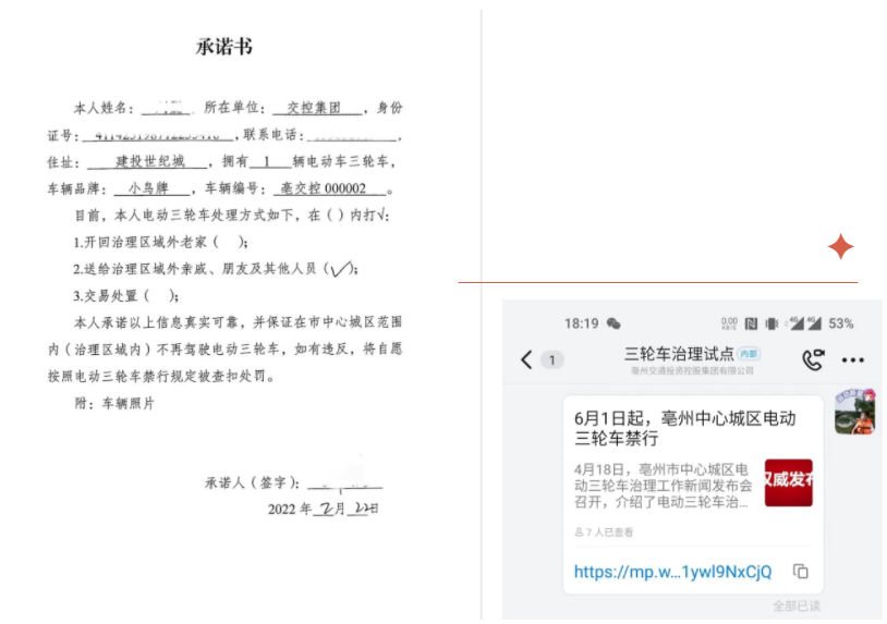 向互聯(lián)網(wǎng)“借力”,通過微信公眾號平臺、釘釘工作群等平臺廣泛開展“一通告”“兩封信”宣傳,確保從上到下、從職能部門到項目一線切實了解電動三輪車治理工作要求,配合完成摸底情況統(tǒng)計,主動簽署《承諾書》,做到堅決支持、嚴格落實,確保已登記處置的285輛三輪車不再上路。