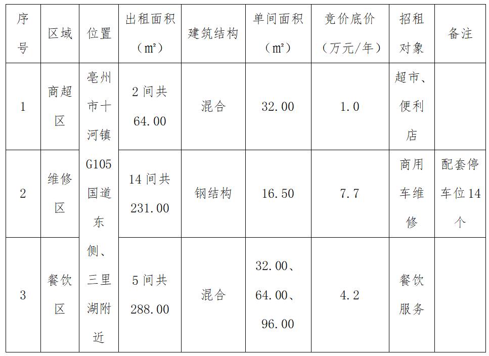(二)招租范圍:本項(xiàng)目招租對象商超、汽車維修、餐飲。招租范圍及競價(jià)底價(jià)詳見下表: