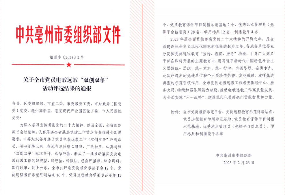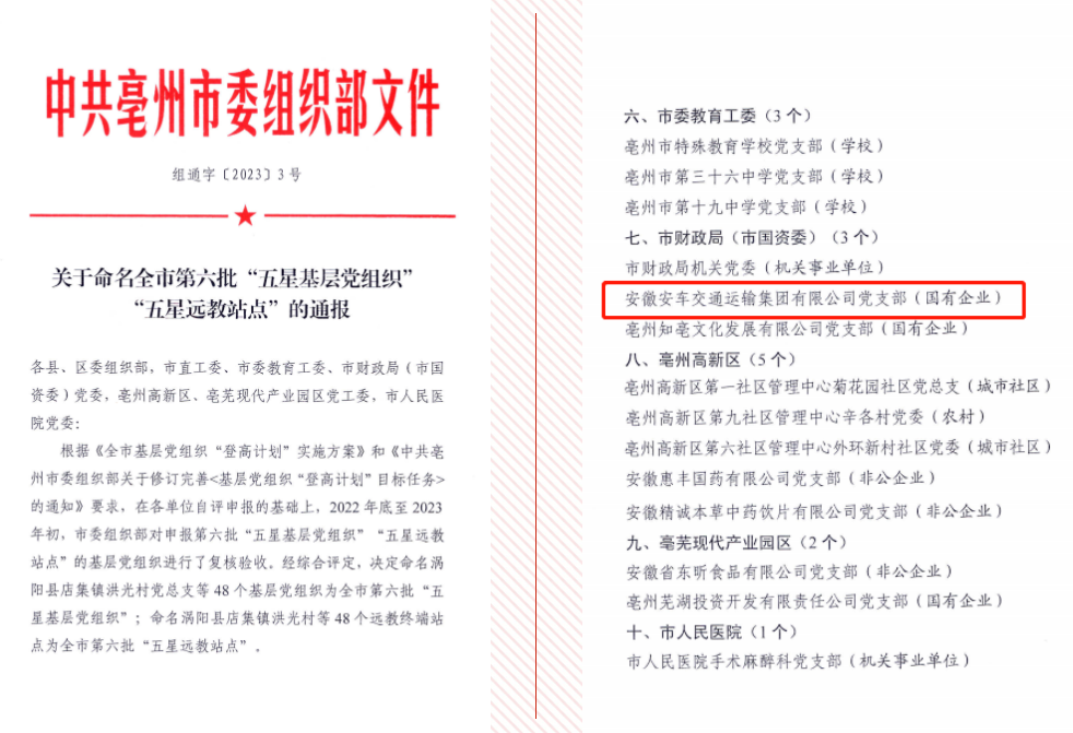 近日,中共亳州市委組織部印發(fā)了《關(guān)于全市黨員電教遠教“雙創(chuàng)雙爭”活動評選結(jié)果的通報》(組通字﹝2023﹞2號)和《關(guān)于命名全市第六批“五星基層黨組織”“五星遠教站點”的通報》(組通字﹝2023﹞3號)文件,安車交通黨支部榮獲“黨員遠程教育示范終端站點”和全市第六批“五星基層黨組織”榮譽稱號。