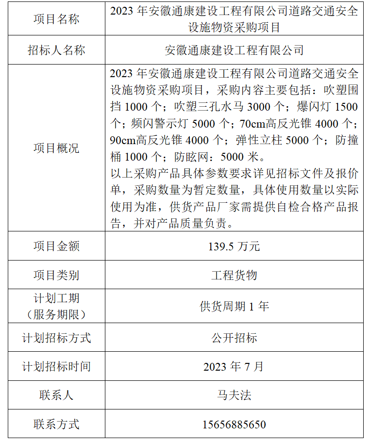 為便于潛在投標(biāo)人及時(shí)了解招標(biāo)信息,現(xiàn)將安徽通康建設(shè)工程有限公司(招標(biāo)人名稱)的招標(biāo)計(jì)劃發(fā)布如下: