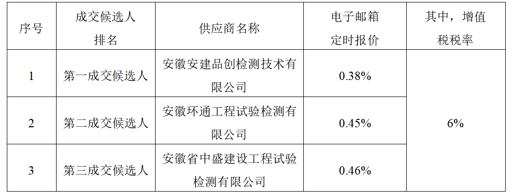 采購人確定安徽安建品創(chuàng)檢測技術(shù)有限公司為標(biāo)包二交竣工檢測成交人,成交價按照施工最終審定價款為基數(shù),費(fèi)率0.38%(其中,增值稅稅率為6%),服務(wù)期限自簽訂工程建設(shè)合同之日起,至工程保修期滿,質(zhì)量標(biāo)準(zhǔn)符合國家、地方、行業(yè)現(xiàn)行相關(guān)規(guī)范合格標(biāo)準(zhǔn)。
