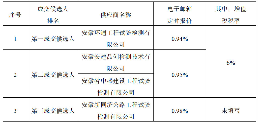 采購人確定安徽環(huán)通工程試驗檢測有限公司為標(biāo)包一中心試驗室成交人,成交價按照施工最終審定價款為基數(shù),費(fèi)率0.94%(其中,增值稅稅率為6%),服務(wù)期限自簽訂工程建設(shè)合同之日起,至工程保修期滿,質(zhì)量標(biāo)準(zhǔn)符合國家、地方、行業(yè)現(xiàn)行相關(guān)規(guī)范合格標(biāo)準(zhǔn)。