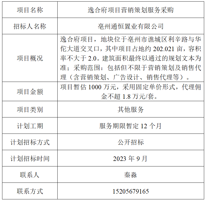為便于潛在投標(biāo)人及時了解招標(biāo)信息,現(xiàn)將亳州通恒置業(yè)有限公司(招標(biāo)人名稱)的招標(biāo)計劃發(fā)布如下: