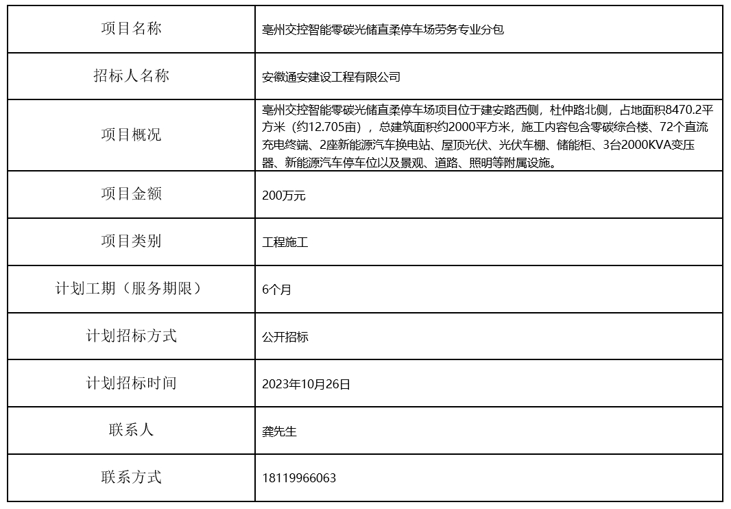 亳州交控智能零碳光儲直柔停車場勞務專業(yè)分包項目招標計劃
