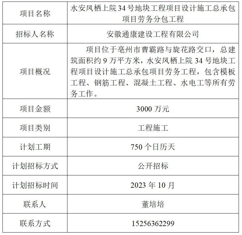 水安鳳棲上院34號(hào)地塊工程項(xiàng)目設(shè)計(jì)施工總承包項(xiàng)目勞務(wù)分包工程招標(biāo)計(jì)劃發(fā)布