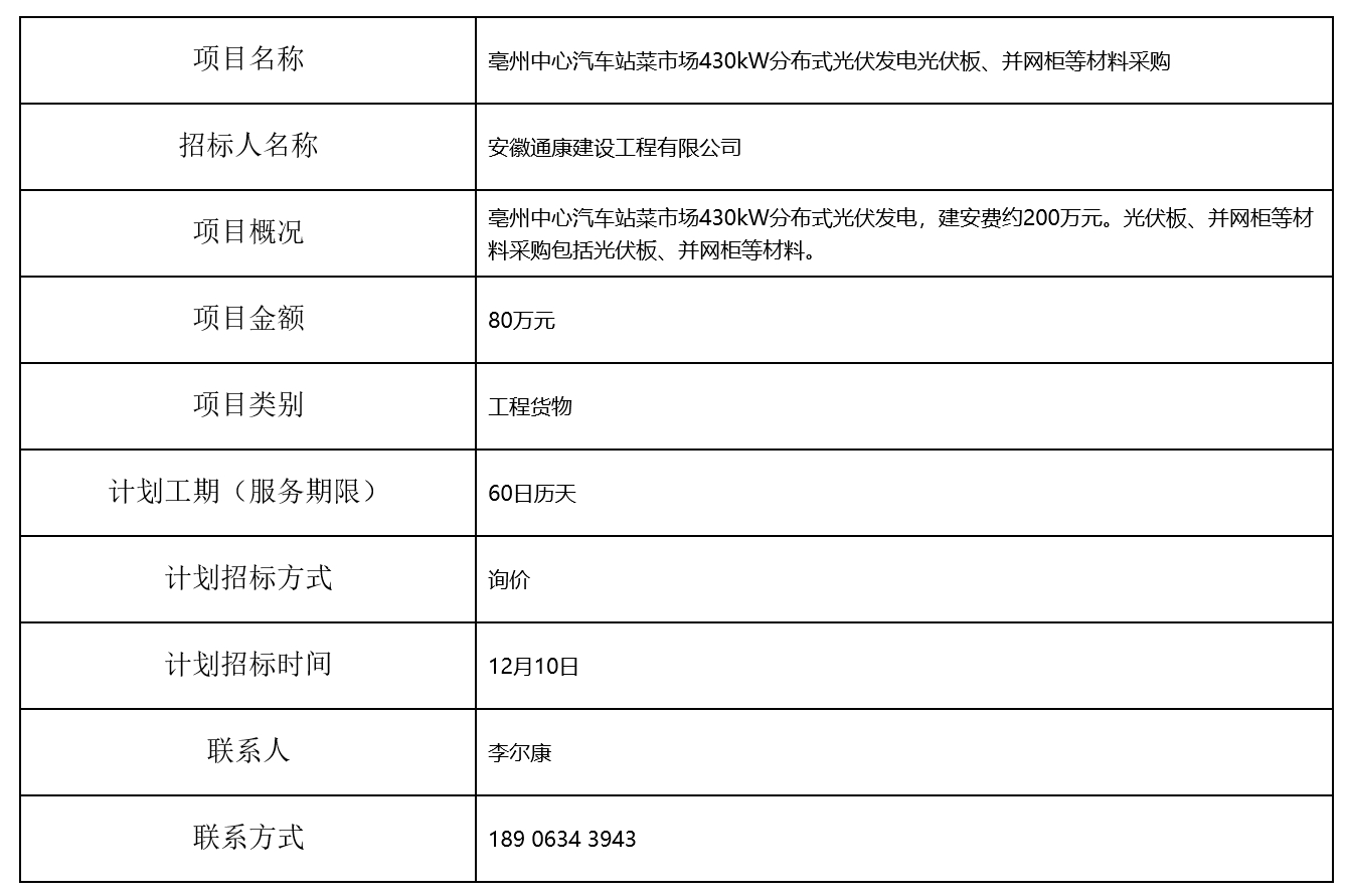 亳州中心汽車(chē)站菜市場(chǎng)430kW分布式光伏發(fā)電光伏板、并網(wǎng)柜等材料采購(gòu)招標(biāo)計(jì)劃