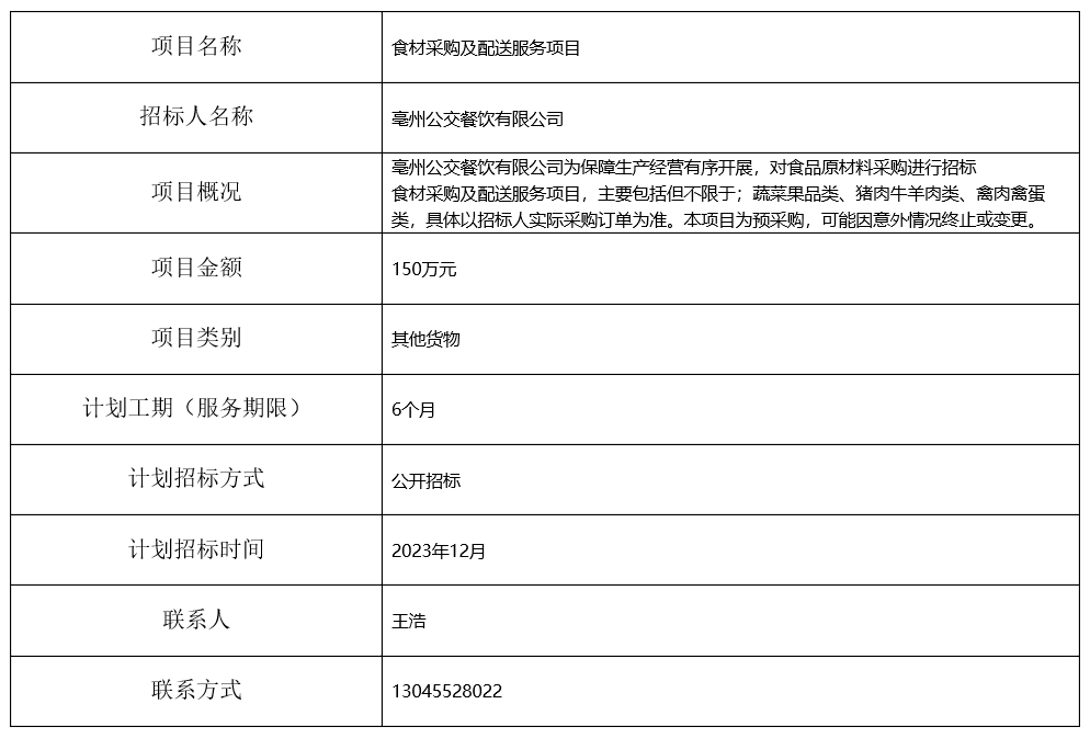 亳州公交餐飲有限公司食材采購及配送服務(wù)項目招標(biāo)計劃