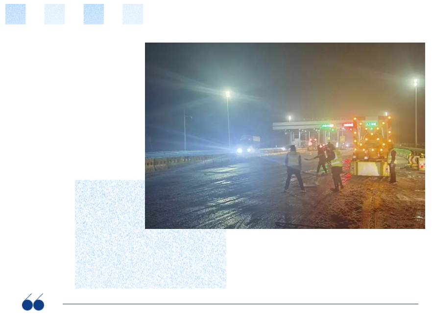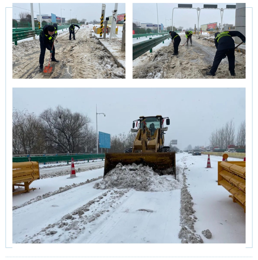 通達(dá)利公司全員值班值守,制定掃雪除冰布置方案,全線共計(jì)安排7個(gè)作業(yè)點(diǎn),每個(gè)作業(yè)點(diǎn)布置1臺(tái)鏟車、1個(gè)隊(duì)伍,確保急彎陡坡、重要橋梁等位置應(yīng)急保通;成立應(yīng)急保障小隊(duì),積極組織人員對(duì)道路進(jìn)行破冰除障,確保車輛進(jìn)出安全。同時(shí),對(duì)道路標(biāo)志、路燈等設(shè)施進(jìn)行檢修維護(hù),切實(shí)提高夜間行車可見(jiàn)性和安全性。共計(jì)出動(dòng)養(yǎng)護(hù)作業(yè)車6輛,融雪劑撒布機(jī)2臺(tái),鏟車7臺(tái),工作人員35人,撒布融雪劑近20噸。