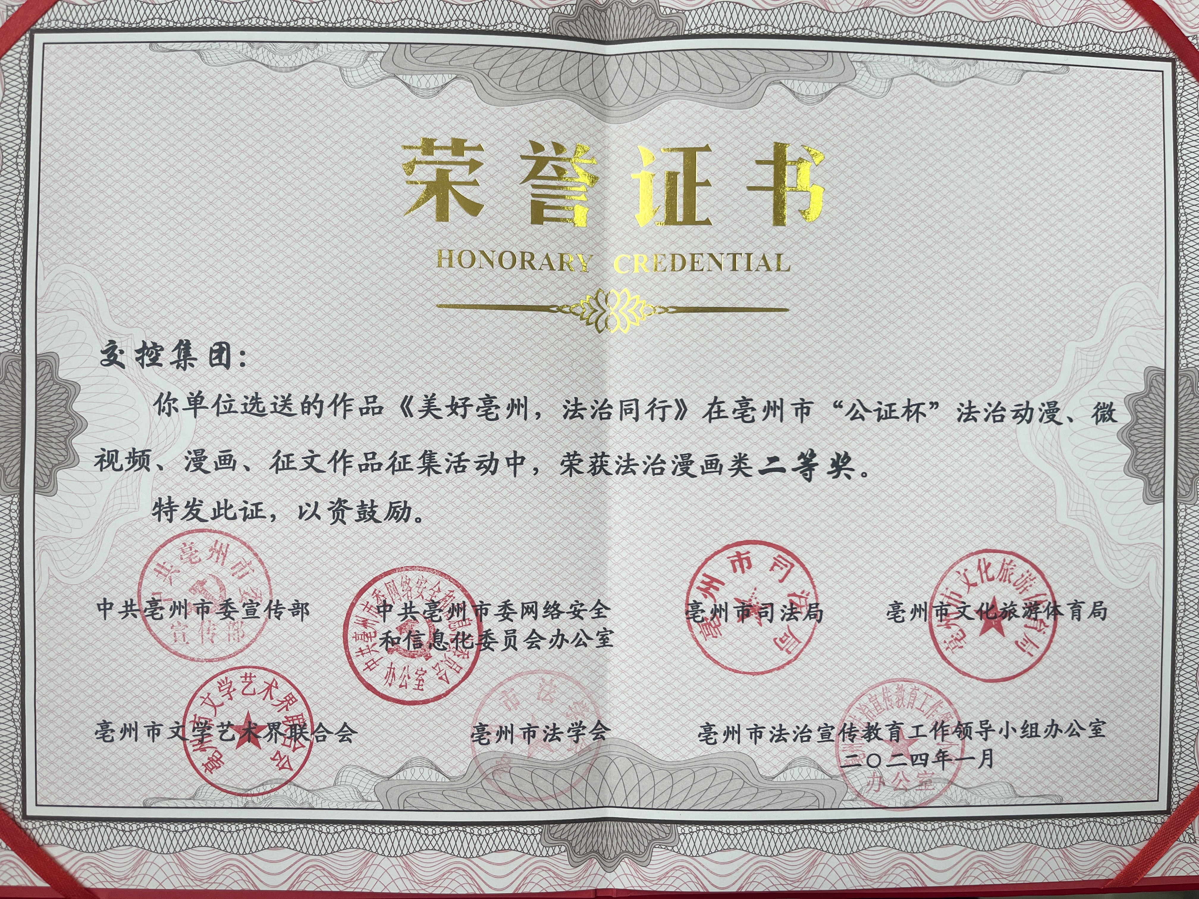 近日,亳州市委宣傳部、市委網(wǎng)信辦、市司法局、市文旅體局、市文聯(lián)、市法學(xué)會(huì)、市法宣辦聯(lián)合發(fā)文通報(bào)了亳州市“公正杯”法治動(dòng)漫、微視頻、漫畫、征文作品征集活動(dòng)獲獎(jiǎng)情況,交控集團(tuán)參賽作品《美好亳州 法治同行》漫畫在全市245部(篇)參賽作品中脫穎而出,榮獲漫畫類二等獎(jiǎng)。
