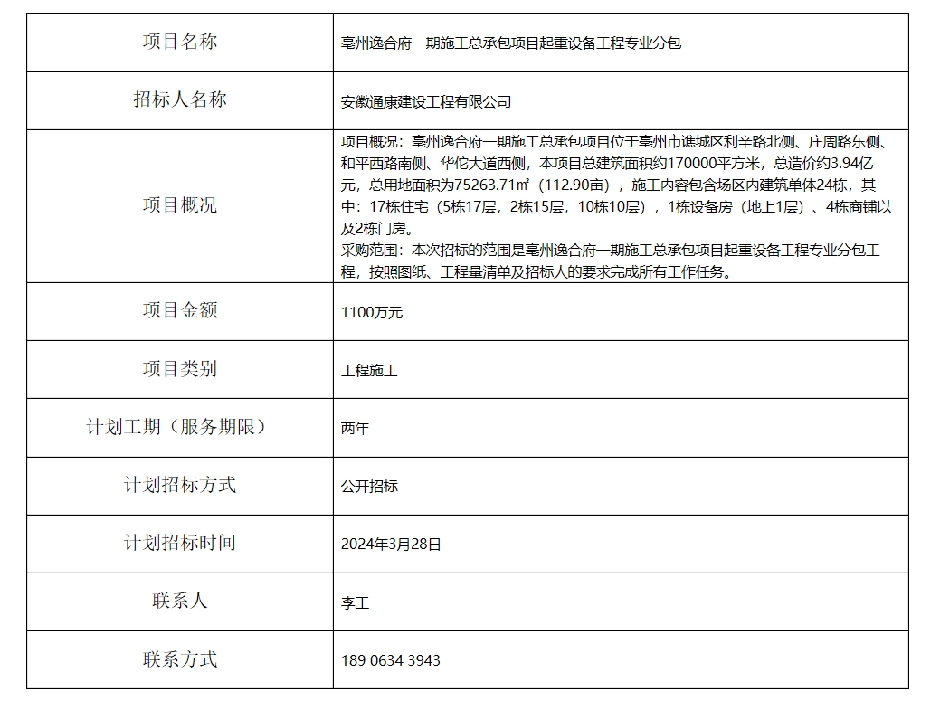 亳州逸合府一期施工總承包項(xiàng)目起重設(shè)備工程專(zhuān)業(yè)分包招標(biāo)計(jì)劃