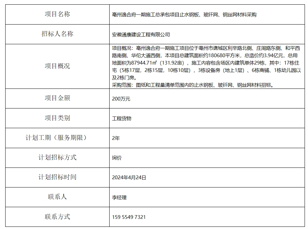 亳州逸合府一期施工總承包項目止水鋼板、玻纖網(wǎng)、鋼絲網(wǎng)材料采購招標(biāo)計劃