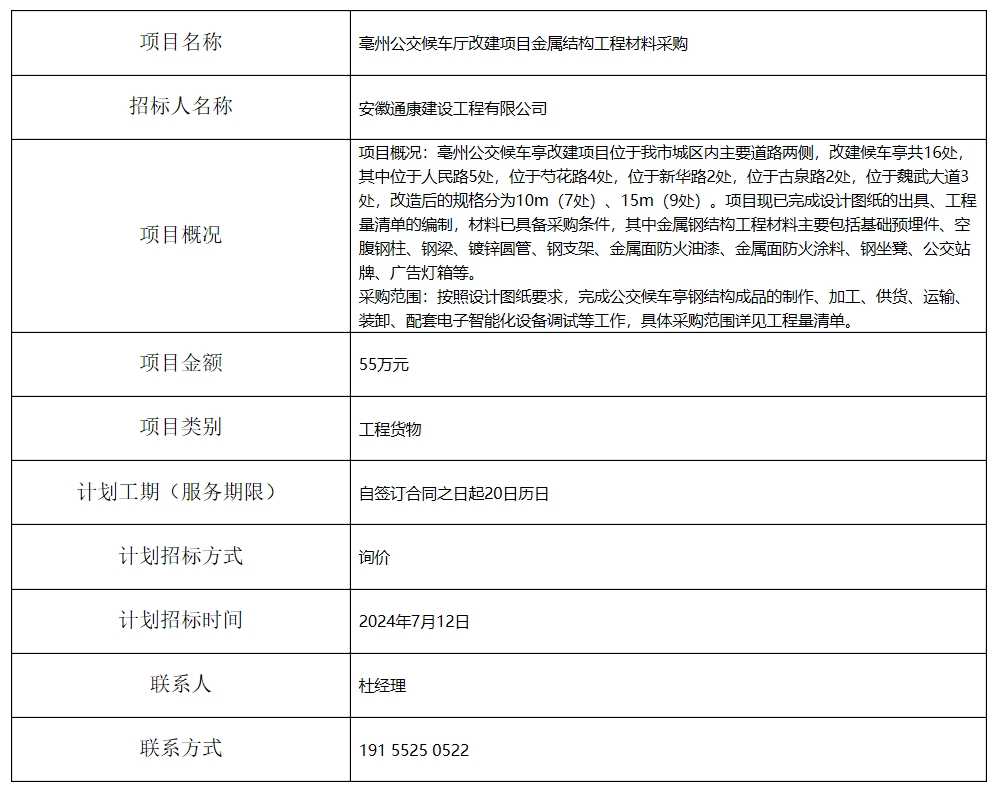 亳州公交候車(chē)廳改建項(xiàng)目金屬結(jié)構(gòu)工程材料采購(gòu)招標(biāo)計(jì)劃