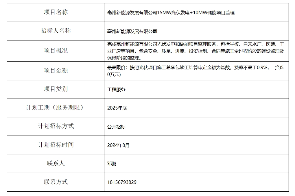 亳州新能源發(fā)展有限公司15MW光伏發(fā)電+10MW儲(chǔ)能項(xiàng)目監(jiān)理招標(biāo)計(jì)劃