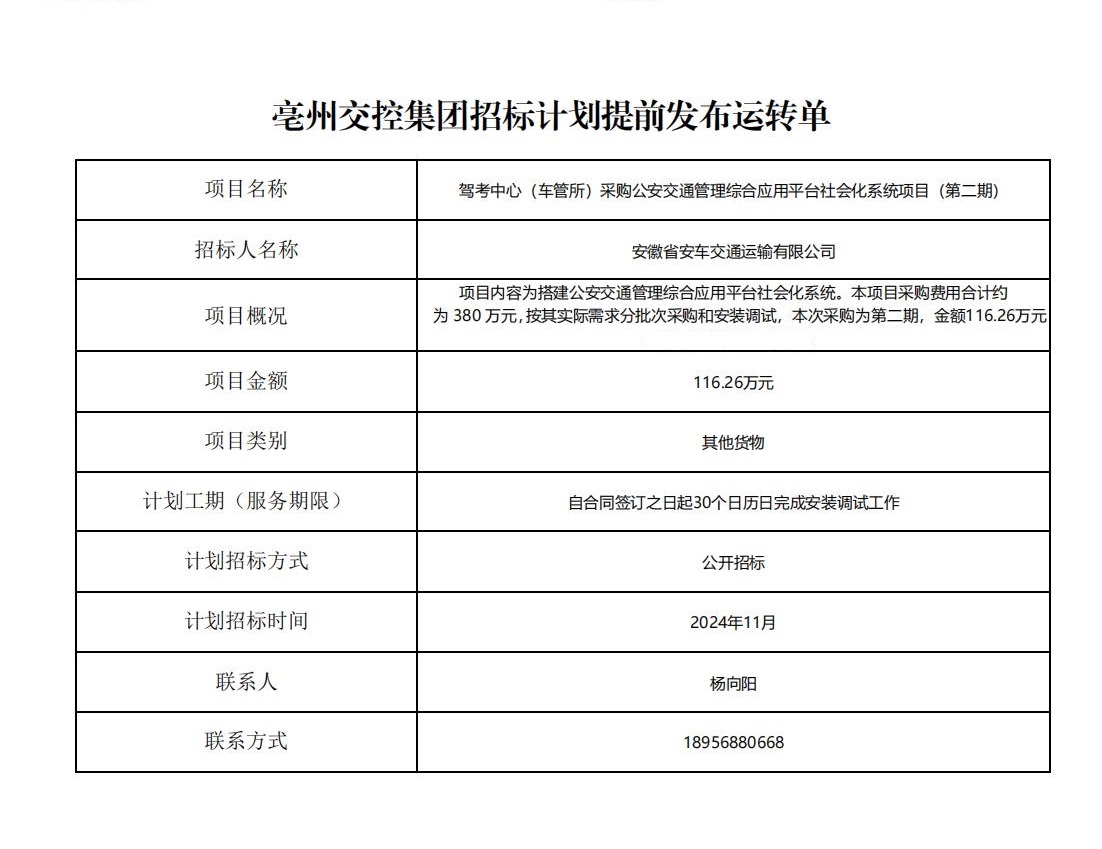 駕考中心(車管所)采購公安交通管理綜合應用平臺社會化系統(tǒng)項目(第二期) 招標計劃