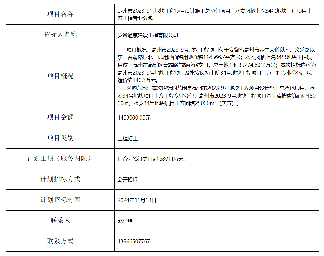 亳州市2023-9號地塊工程項目設計施工總承包項目、水安鳳棲上院34號地塊工程項目土方工程專業(yè)分包招標計劃