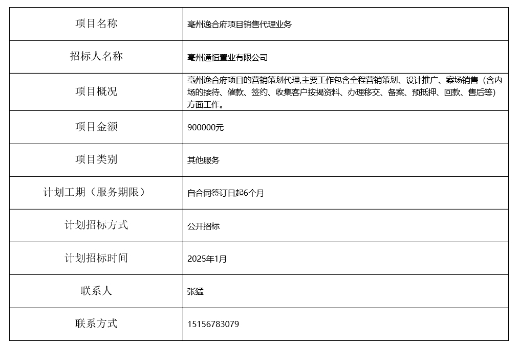亳州逸合府項(xiàng)目銷售代理業(yè)務(wù)招標(biāo)計(jì)劃