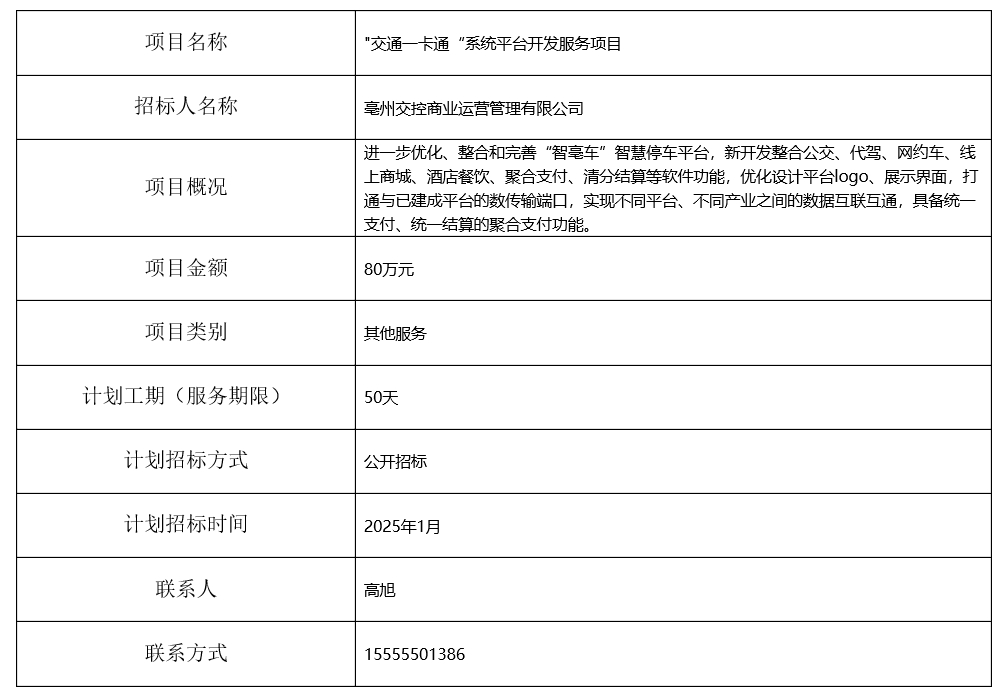 "交通一卡通“系統(tǒng)平臺開發(fā)服務(wù)項目 招標(biāo)計劃