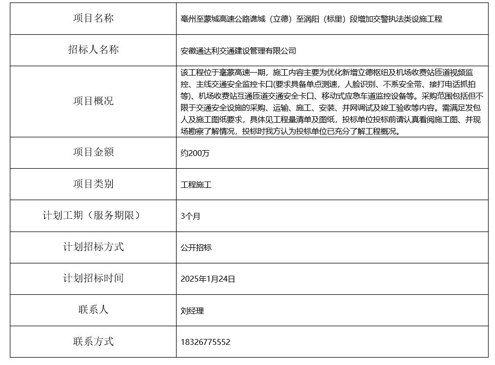 亳州至蒙城高速公路譙城(立德)至渦陽(標(biāo)里)段增加交警執(zhí)法類設(shè)施工程招標(biāo)計劃