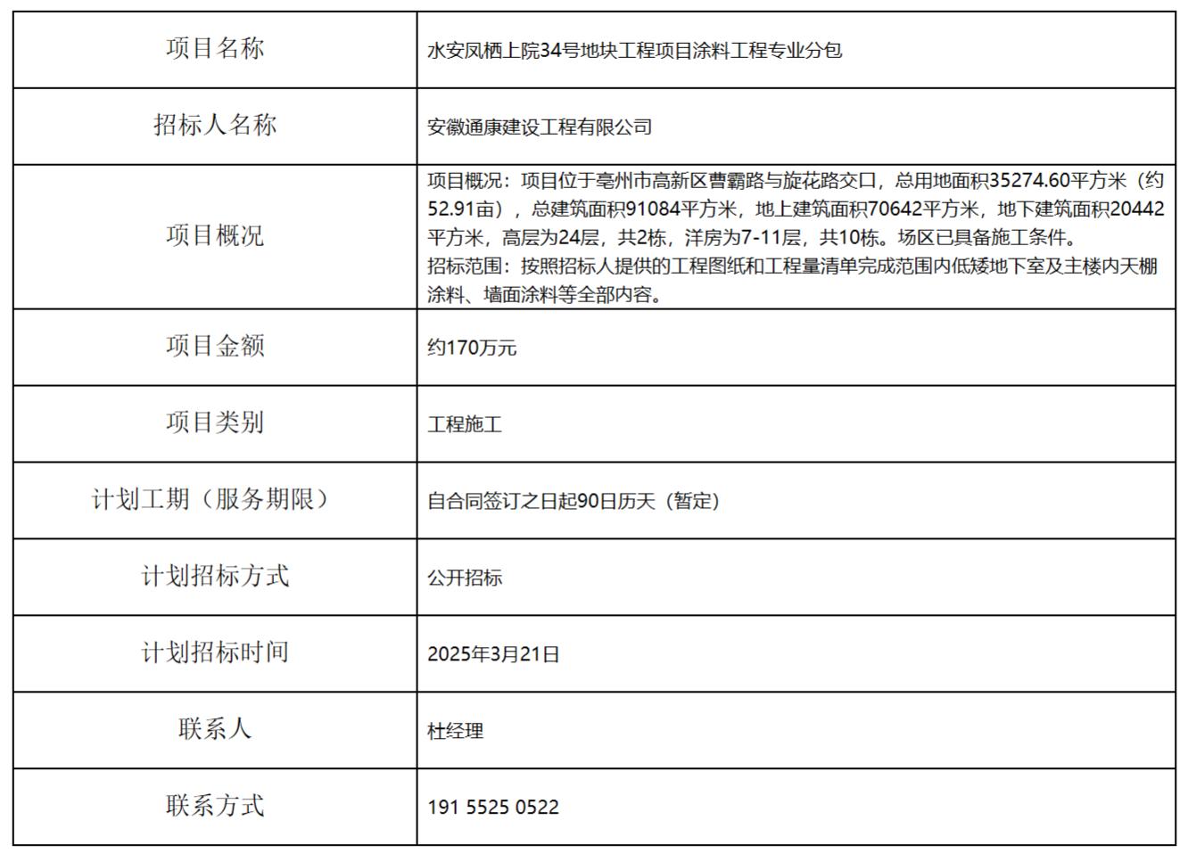 水安鳳棲上院34號(hào)地塊工程項(xiàng)目涂料工程專(zhuān)業(yè)分包招標(biāo)計(jì)劃