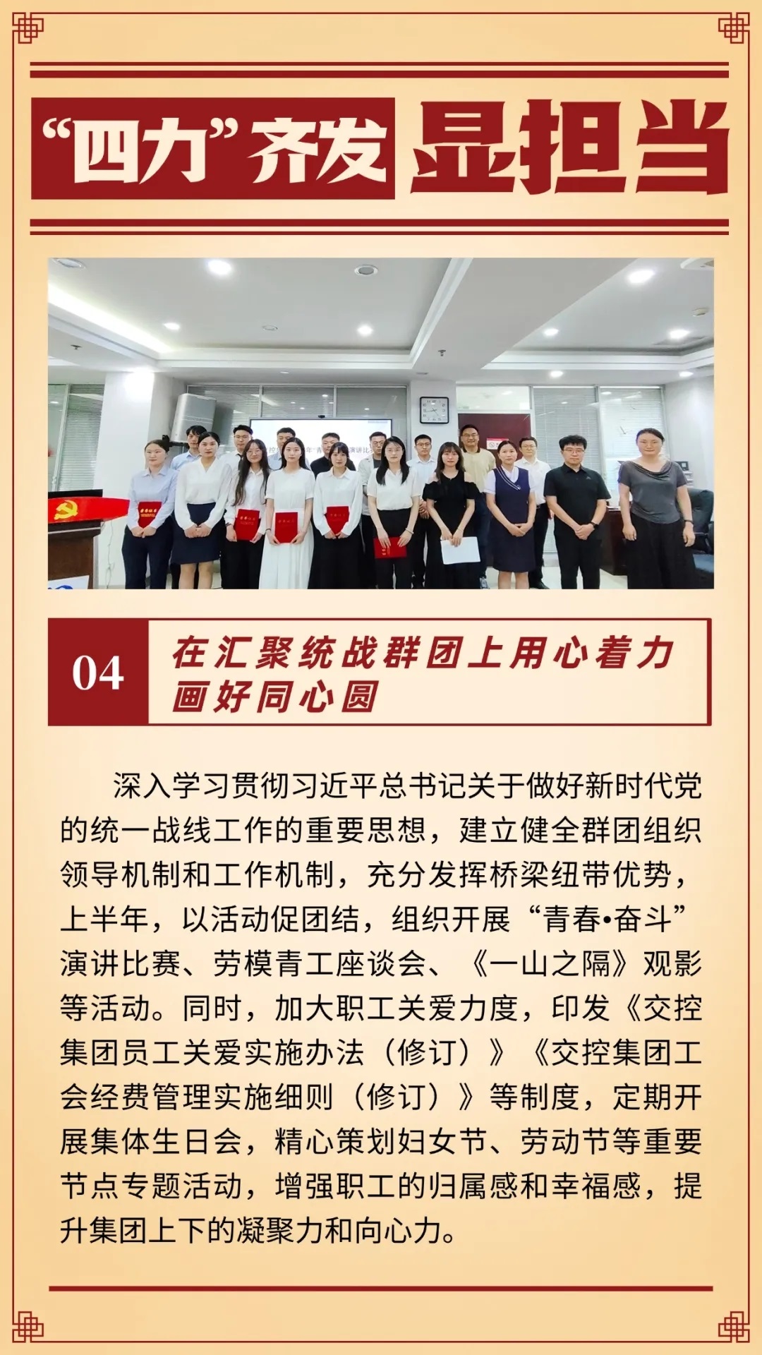 今年以來,交控集團黨委堅持以習(xí)近平新時代中國特色社會主義思想為指導(dǎo),緊緊圍繞年度發(fā)展目標(biāo),聚焦主責(zé)主業(yè),以提升“四力”為抓手,持續(xù)推動黨建工作提質(zhì)增效,為集團高質(zhì)量發(fā)展提供堅強政治和組織保證。