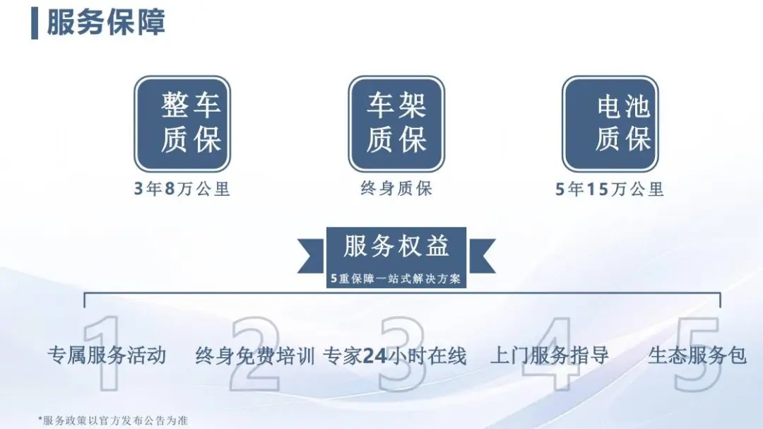 專屬質(zhì)保終身守護,整車保修期3年或8萬公里;動力電池保修期5年或15萬公里;車架2年包換,終身包修。