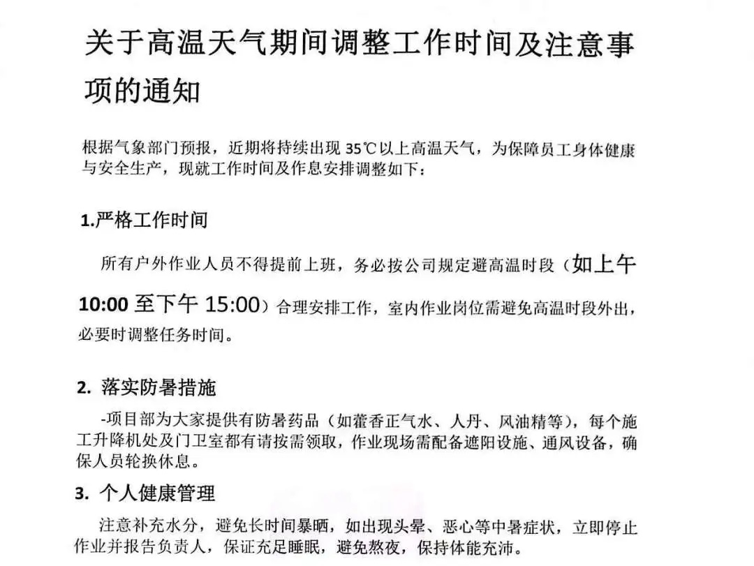 嚴格落實高溫天氣施工安全各項要求,指導各項目科學調(diào)整作業(yè)時間,全面推行“抓兩頭、歇中間”模式,剛性執(zhí)行高溫時段室外停工規(guī)定,嚴禁盲目搶趕工期,合理安排工序銜接,強化施工計劃管理,確保生產(chǎn)安全、有序推進。