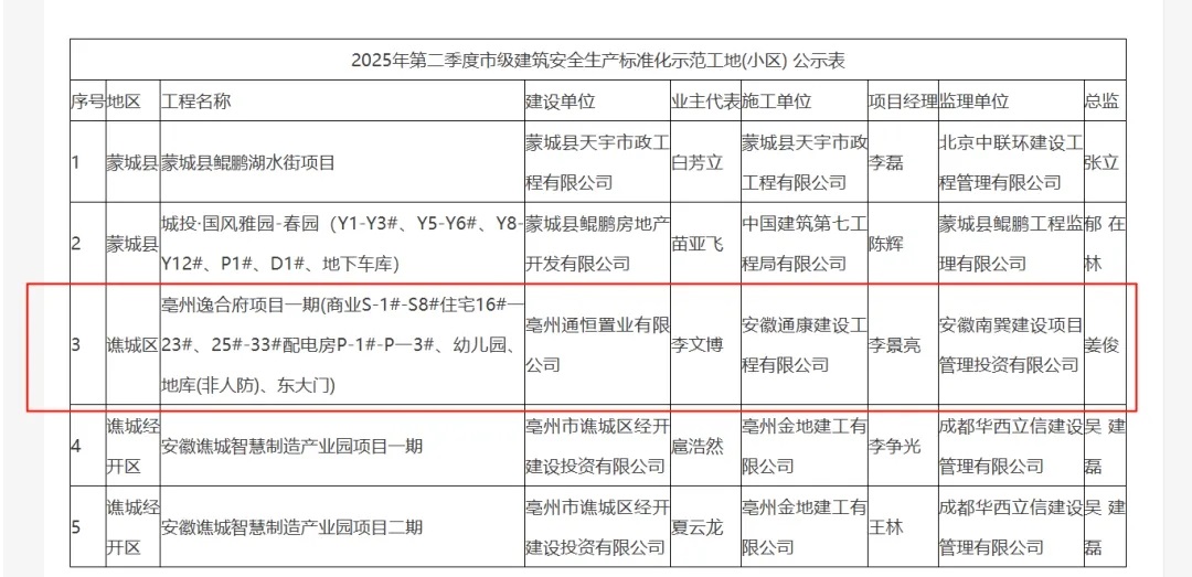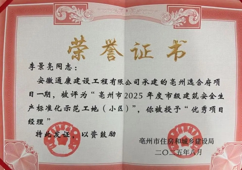 近日,由通康公司承建的亳州逸合府項(xiàng)目一期工程榮獲“2025年第二季度市級(jí)建筑安全生產(chǎn)標(biāo)準(zhǔn)化示范工地(小區(qū))”榮譽(yù)稱號(hào),李景亮同志榮獲“優(yōu)秀項(xiàng)目經(jīng)理”榮譽(yù)稱號(hào)。