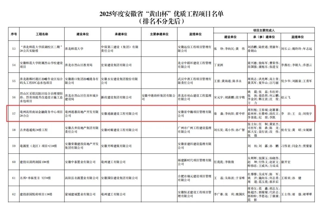 近日,安徽省住房和城鄉(xiāng)建設(shè)廳公示了2025年度安徽省建設(shè)工程“黃山杯”獎(jiǎng)(省優(yōu)質(zhì)工程)項(xiàng)目名單,由通康公司承建的亳州高鐵南站商務(wù)中心項(xiàng)目2#樓成功榮獲2025年度安徽省建設(shè)工程“黃山杯”獎(jiǎng)。