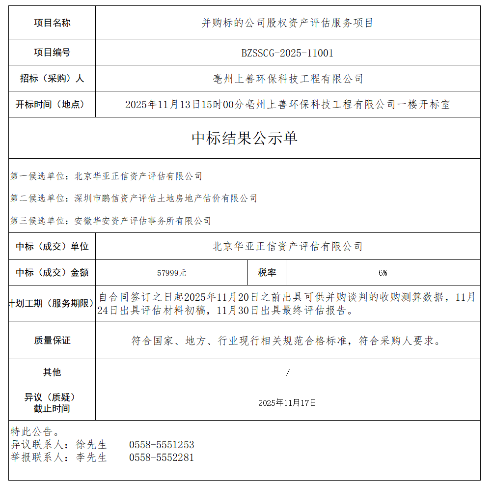 上善環(huán)保科技工程有限公司并購標(biāo)的公司股權(quán)資產(chǎn)評估服務(wù)項目中標(biāo)結(jié)果公示