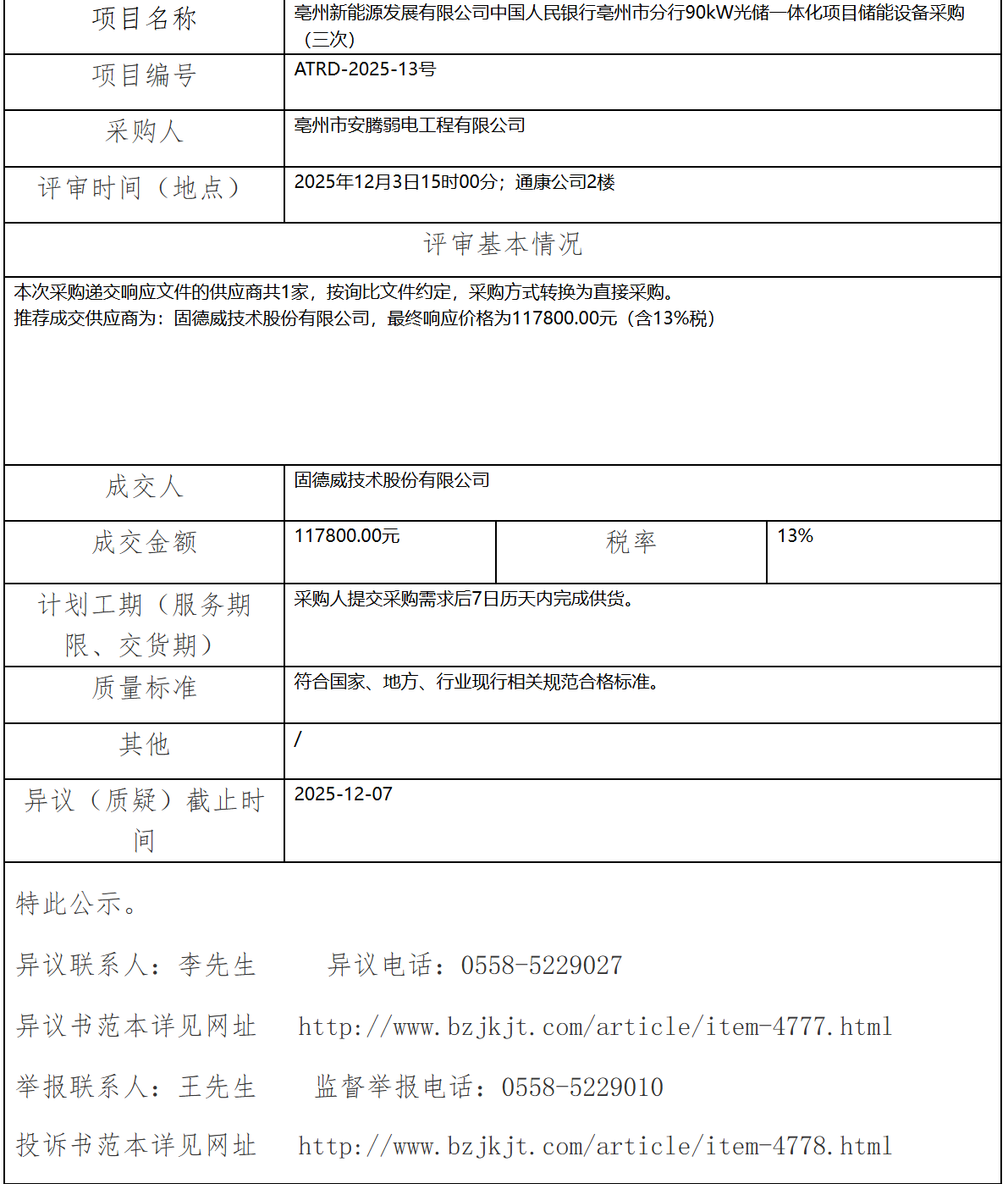 亳州新能源發(fā)展有限公司中國人民銀行亳州市分行90kW光儲一體化項(xiàng)目儲能設(shè)備采購(三次)成交結(jié)果公示