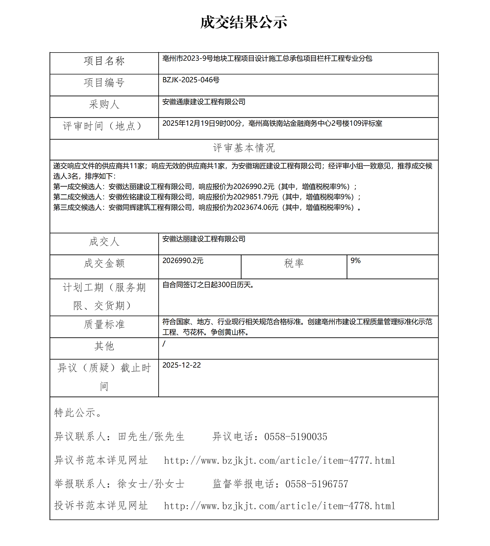 亳州市2023-9號(hào)地塊工程項(xiàng)目設(shè)計(jì)施工總承包項(xiàng)目欄桿工程專業(yè)分包成交結(jié)果公示