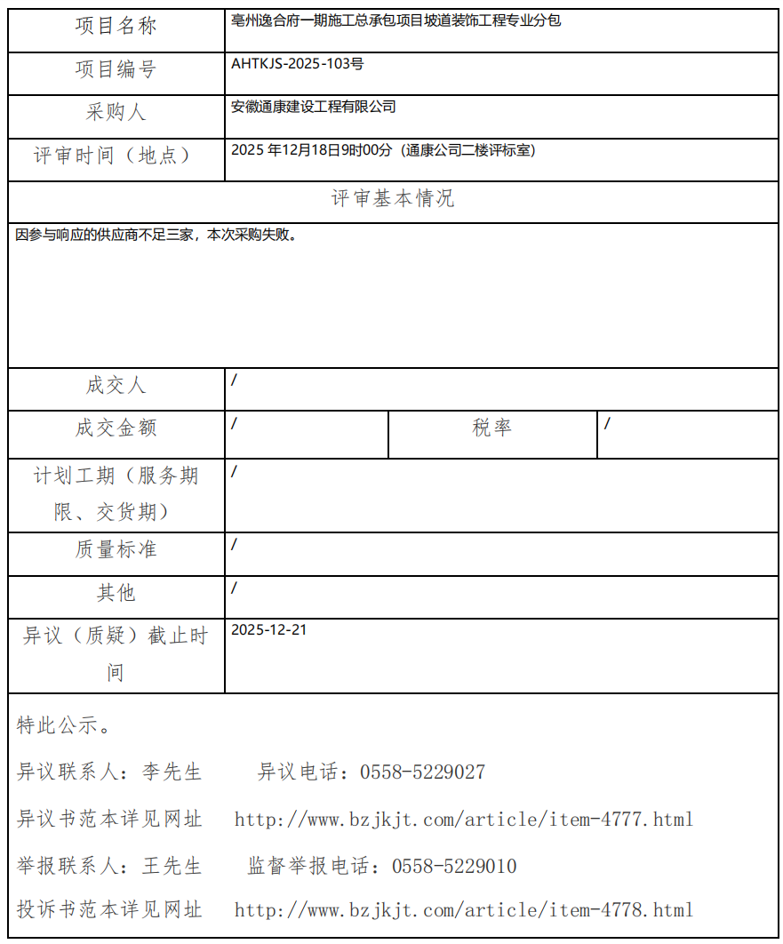 亳州逸合府一期施工總承包項目坡道裝飾工程專業(yè)分包成交結(jié)果公示