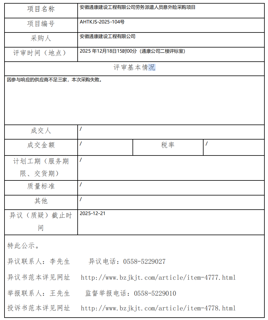 安徽通康建設工程有限公司勞務派遣人員意外險采購項目成交結果公示