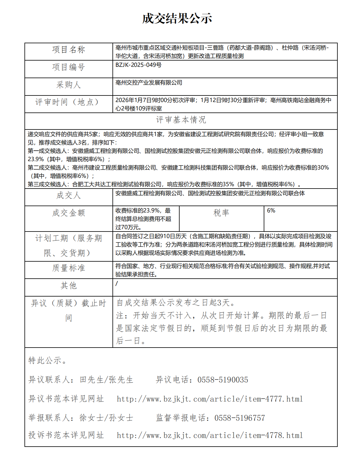 亳州市城市重點(diǎn)區(qū)域交通補(bǔ)短板項(xiàng)目-三曹路(藥都大道-薛閣路)、杜仲路(宋湯河橋-華佗大道,含宋湯河橋加寬)更新改造工程質(zhì)量檢測(cè)成交結(jié)果公示