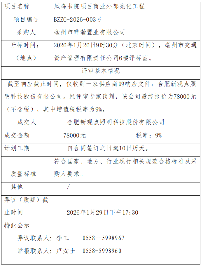 鳳鳴書院項目商業(yè)外部亮化工程成交結果公示