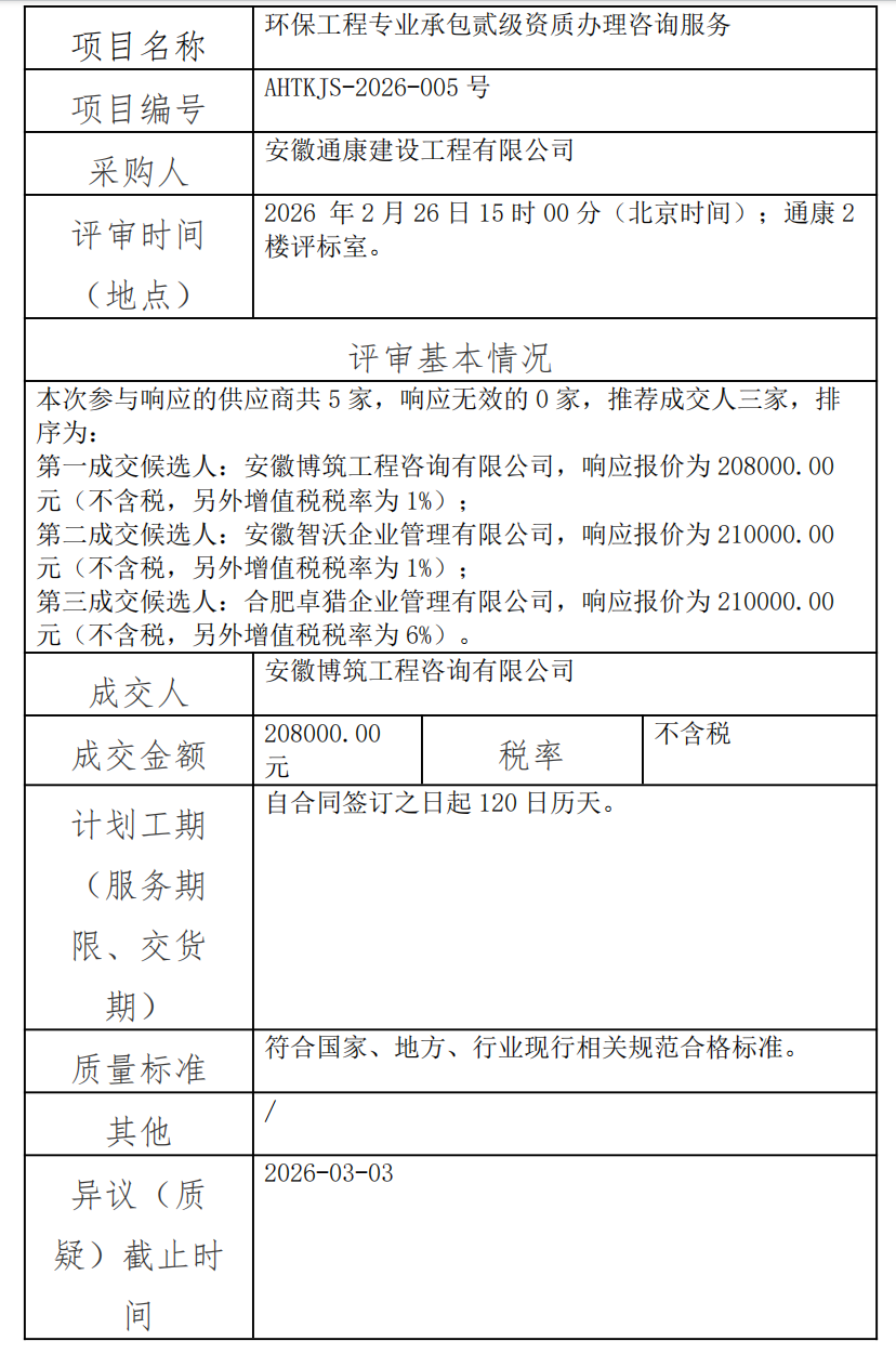 環(huán)保工程專業(yè)承包貳級資質(zhì)辦理咨詢服務(wù)成交結(jié)果公示