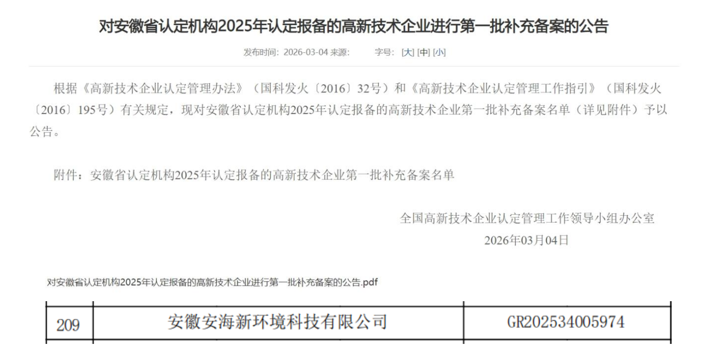 近日,全國(guó)高新技術(shù)企業(yè)認(rèn)定管理工作領(lǐng)導(dǎo)小組辦公室公布了安徽省2025年第二批高新技術(shù)企業(yè)名單,安車集團(tuán)下屬安徽安海新環(huán)境科技有限公司(以下簡(jiǎn)稱“安海新公司”)順利通過國(guó)家高新技術(shù)企業(yè)認(rèn)定,成為亳州市環(huán)境檢測(cè)領(lǐng)域首家獲此殊榮的單位。