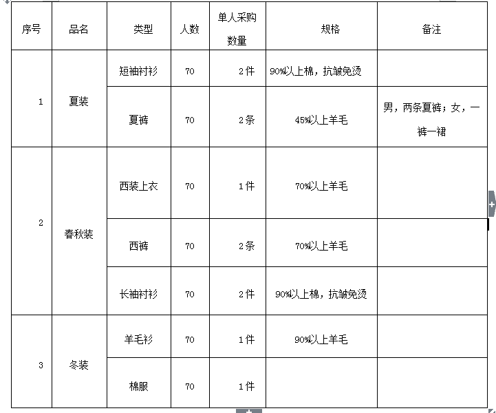 四、人員范圍:配置工作服的人員為集團(tuán)公司在崗的全體員工,約70人。(以實(shí)際采購數(shù)量為準(zhǔn))